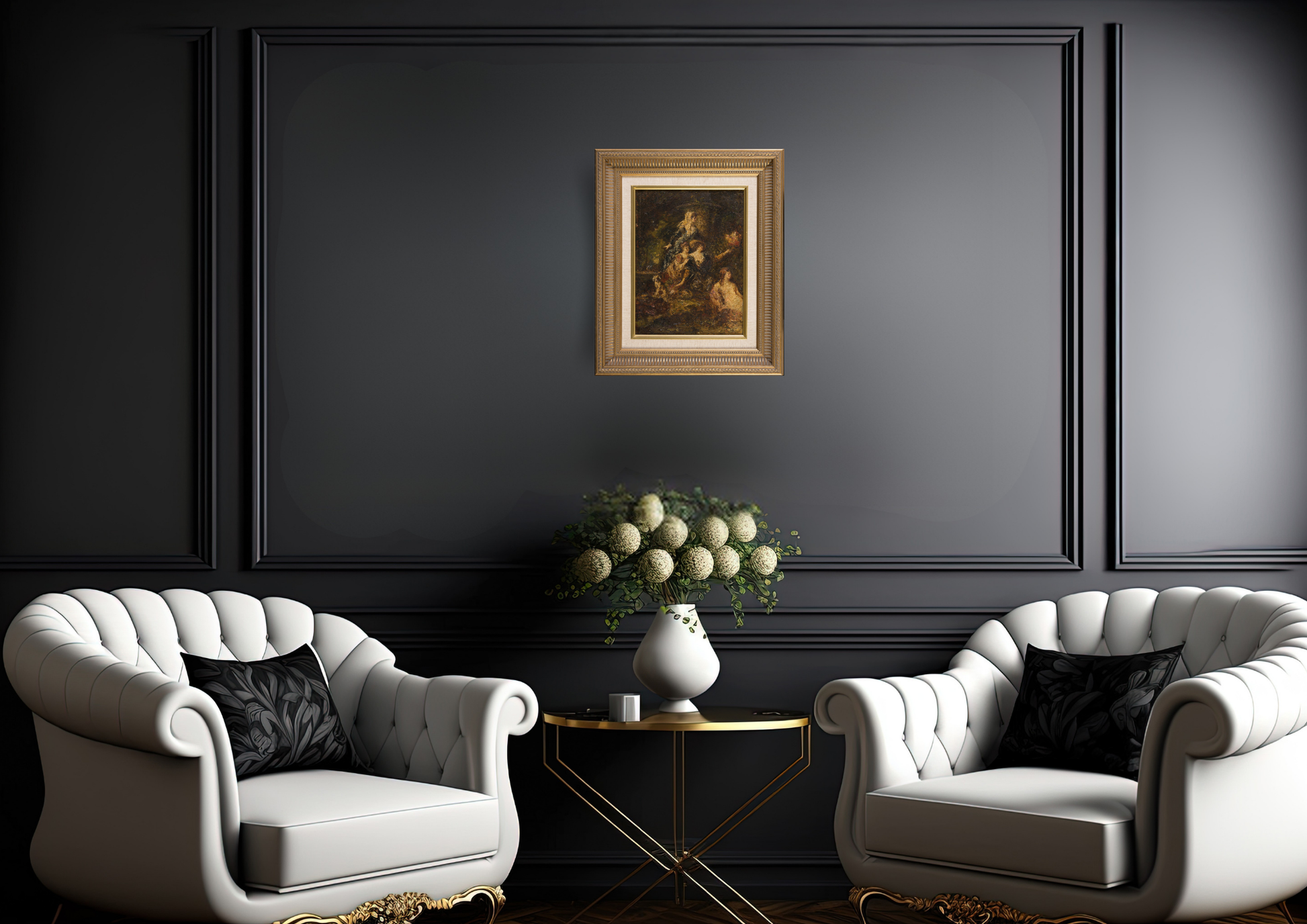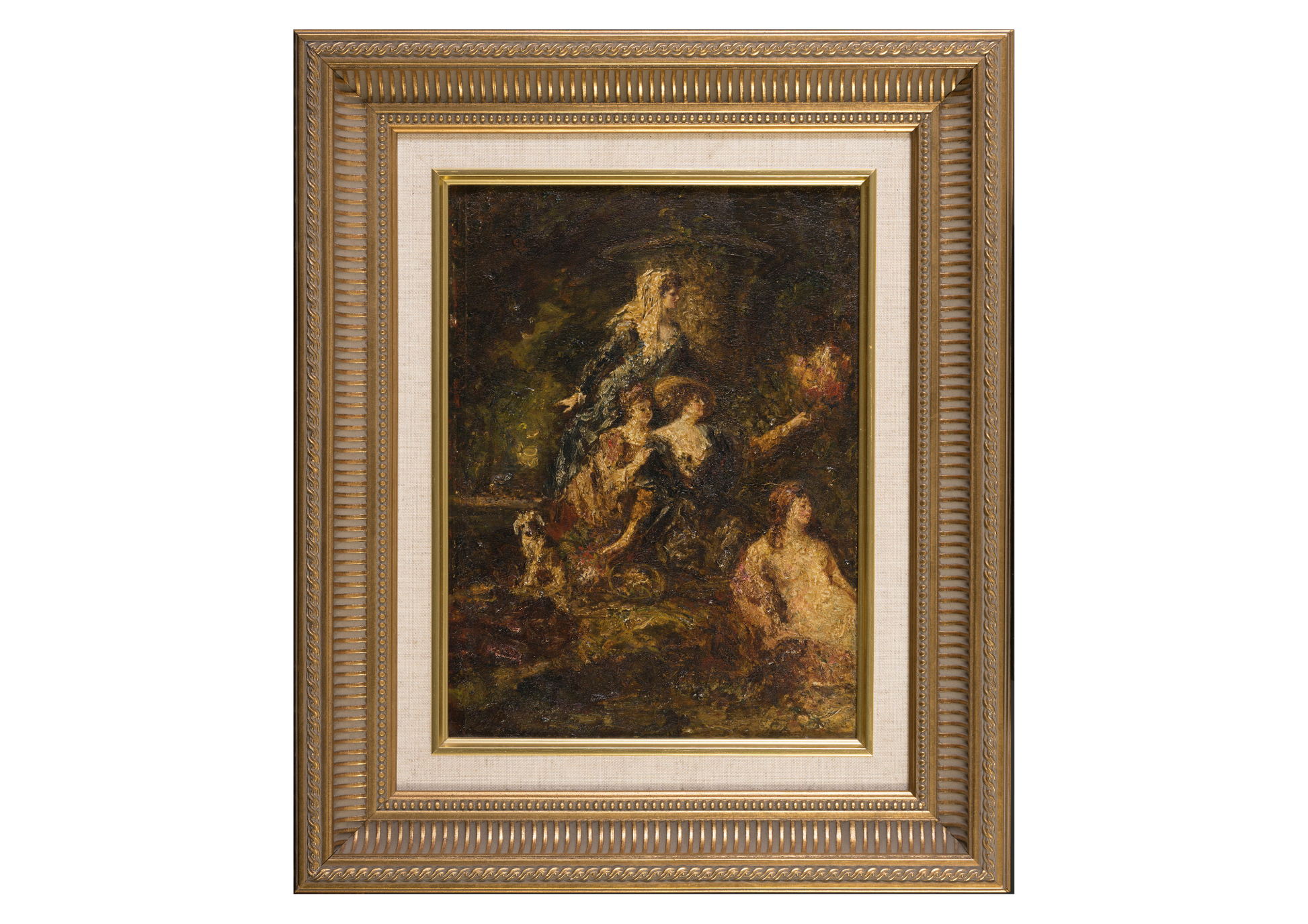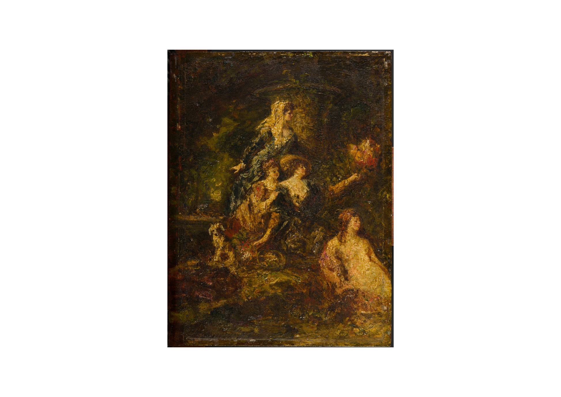 Adolphe Joseph Thomas Monticelli 1824-1886, was a French painter and influencer of Vincent van Gogh. Monticelli was well known to Theo and Vincent Van Gogh, Theo acted as agent for Monticelli in order to sell his works, Vincent knew his paintings very well and was impressed by their thick impasto and unauthenticity with regards to the Salon authorities who thought him mad, consequently when Monticelli died Vincent wrote to Theo claiming that he would carry on where Monticelli left off. The similarity in their works is readily apparent and a style in which Vincent carried on to his own demise. Monticelli was a brilliant artist and has been very much underrated, however during his lifetime he was in great demand especially here in the UK, the Scottish art dealer and collector Alex Reid was a big buyer of his paintings so much so he was known as Monticelli Reid. Monticelli trained in Paris at the Ecole des Beaux Arts and under Paul Delaroche, he is known to have painted with the Barbizon School of painters in the forest of Fontainebleau, where this image may have been inspired and designed, he was influenced in the Romantic style of Watteau. His works are still widely sought and collected despite the general lack of recognition throughout the World's art aficionados who regularly deny his brilliance, I think he was a great artist. This picture is unsigned, however there is an indecipherable script at the lowest point of the picture, which maybe the signature but we have erred on the side of caution.