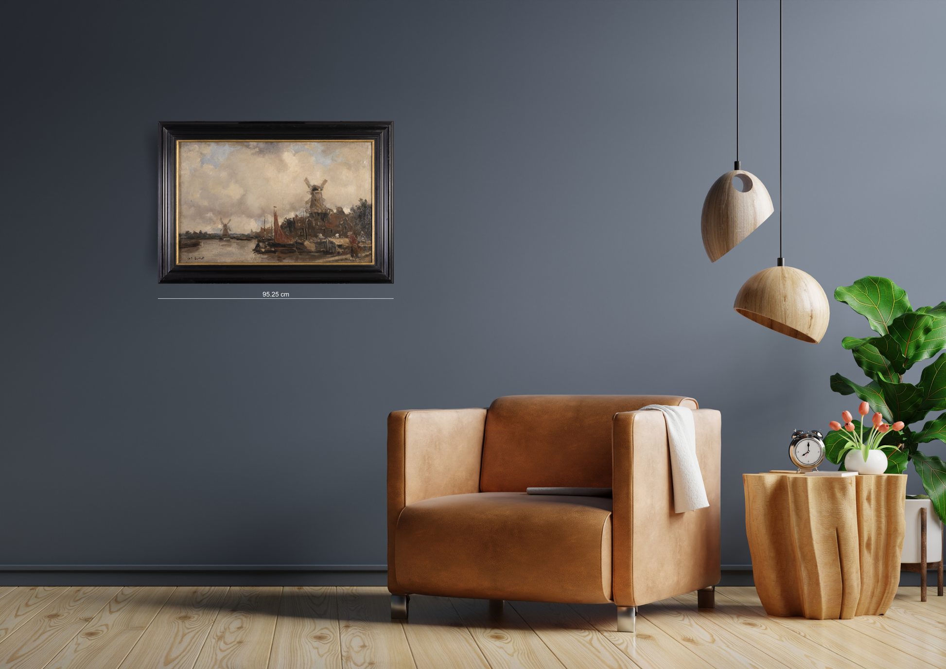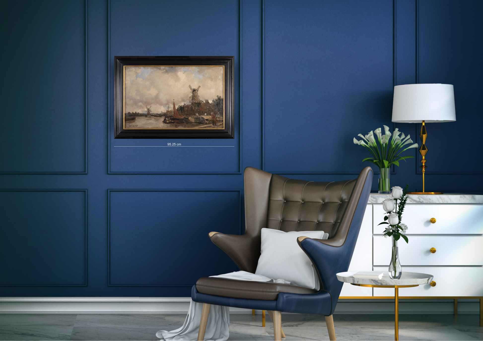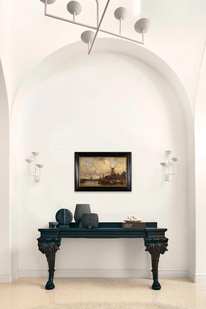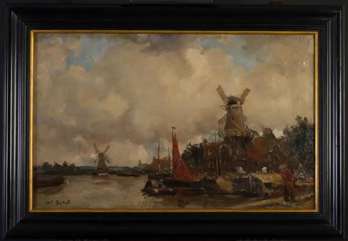This painting is signed and a very rare and early work of Joanna Bauer as there are very few of her works known to exist and fewer preserved, the view could be Haarlem or Amsterdam. There is an image to the reverse of this picture which has been over painted of a standing figure, it is in the style of Marius Bauer and we think probably by him, however we believe the canvas has been turned over and Joanna has re-used the canvas to paint this picture.