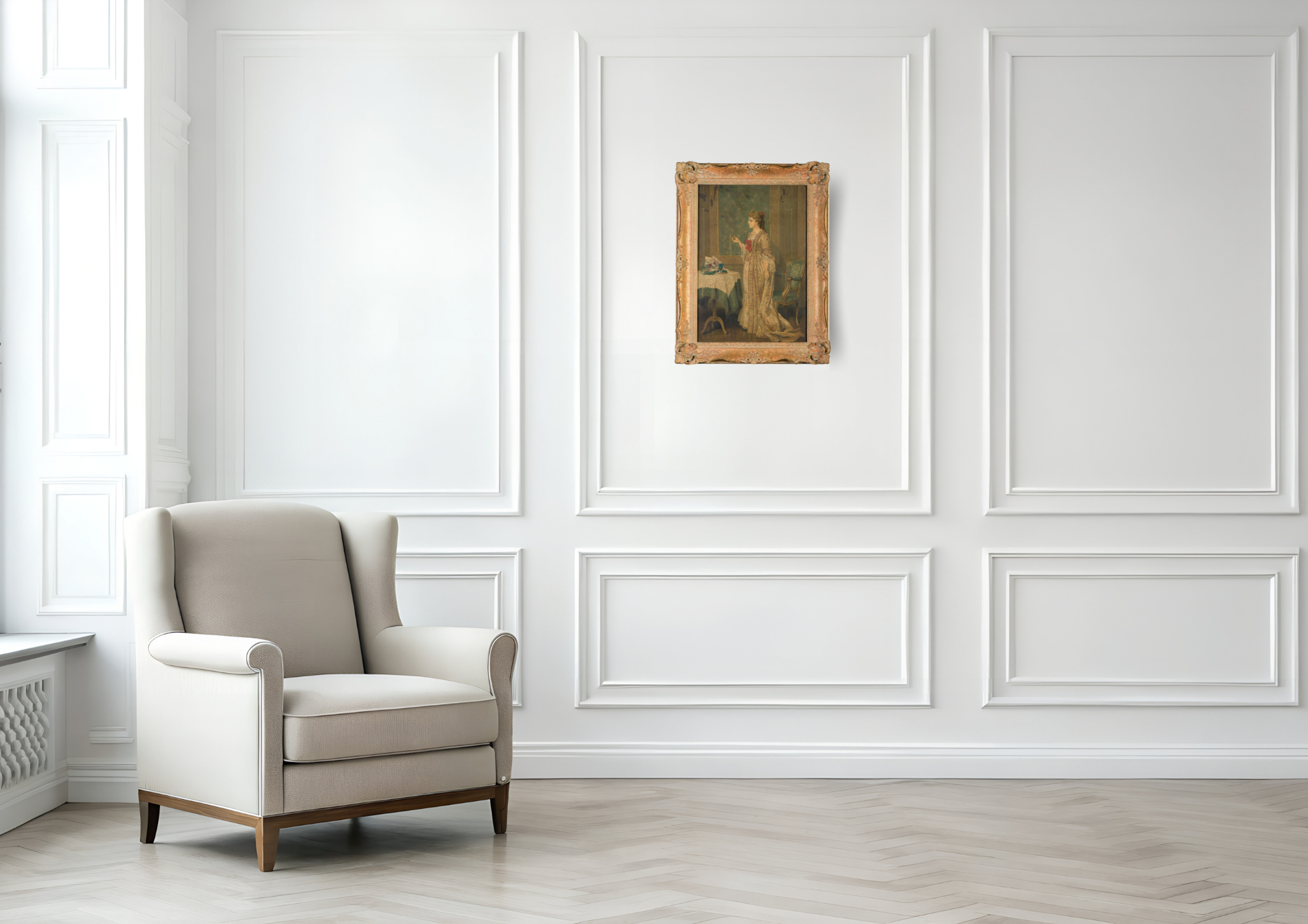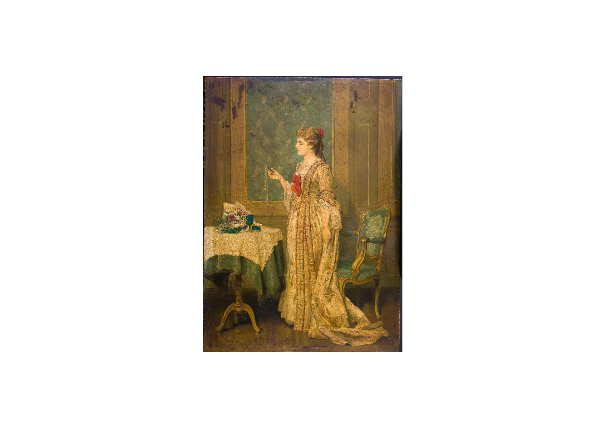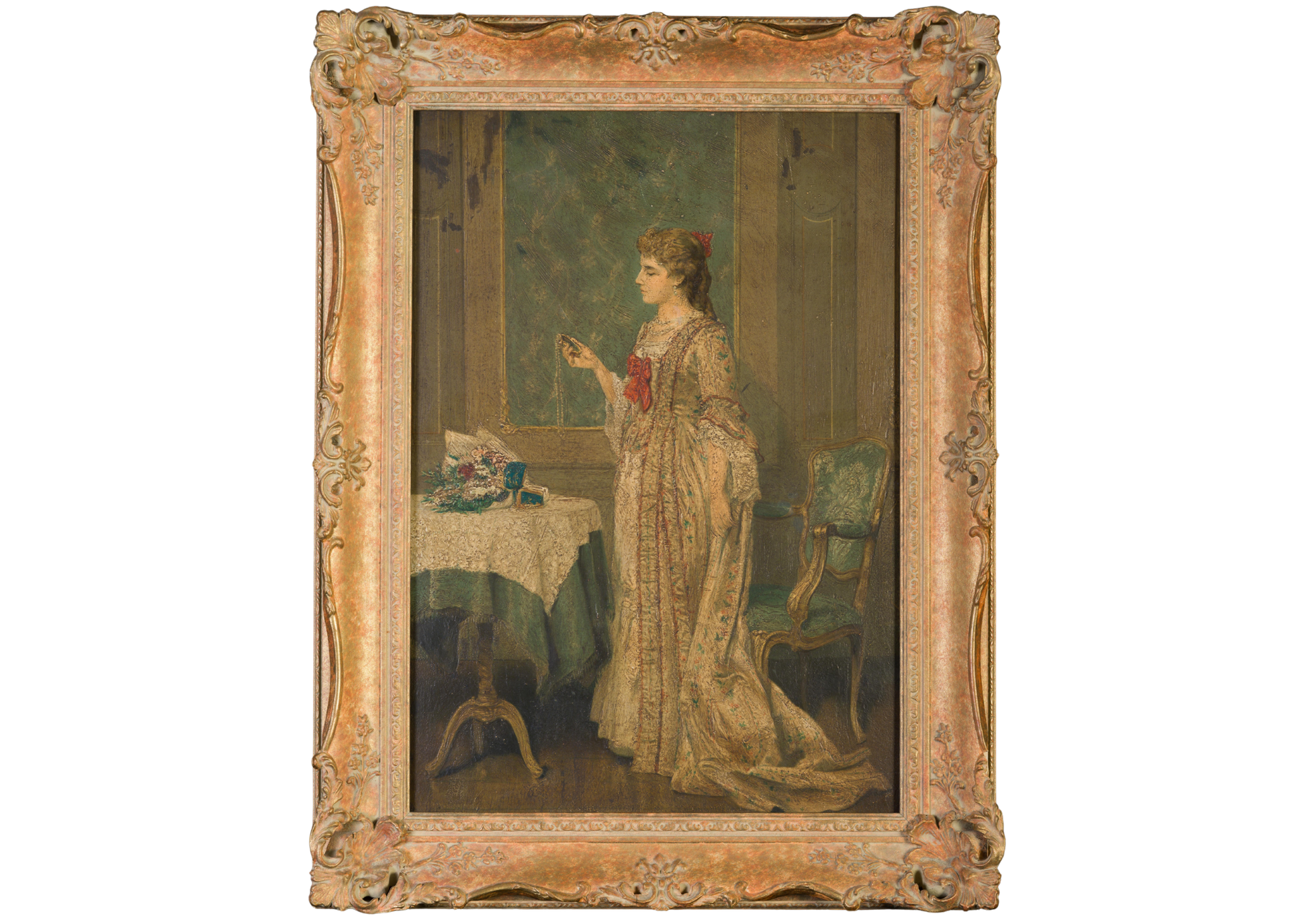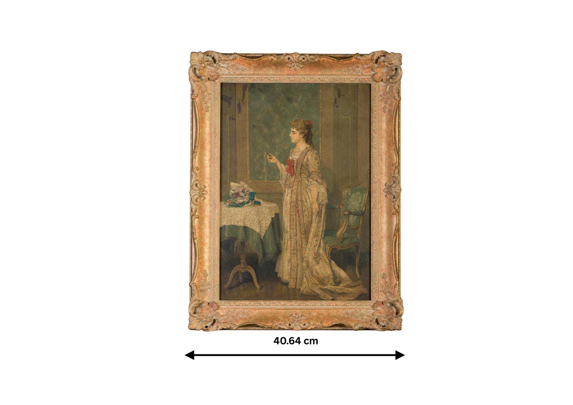 Auguste Serrure 1825 - 1903, was a Flemish born painter. The description of his birthplace is generally described as Belgium, however the Flemish nationality became Belgian in 1830 after the Revolution. Serrure painted genre interior subjects in a familiar 18th and 19th Century manner, he apprenticed under the Dutch painter Braekeleer and soon became known for his interior Dutch everyday life scenes generally among the wealthier classes. His depictions display a calm collected emotion of the scene, he exhibited in 1861 in Antwerp he also exhibited in Brussels and London, his works presented themselves as a charming event of quietude. He was a very private individual whose biography is somewhat obscure, however he died in Brussels where a large contingent of painters chose to live and was known well enough in those circles of artists. This painting is oil on mahogany panel, which in itself is a wealthy painter's board and consequently this picture would have been sold to a very well to do client, the subject shows a comfortably attired lady examining a broach or miniature, it is a prime example of the leisured classes pastime. The painting is signed and dates between 1890 and 1903.