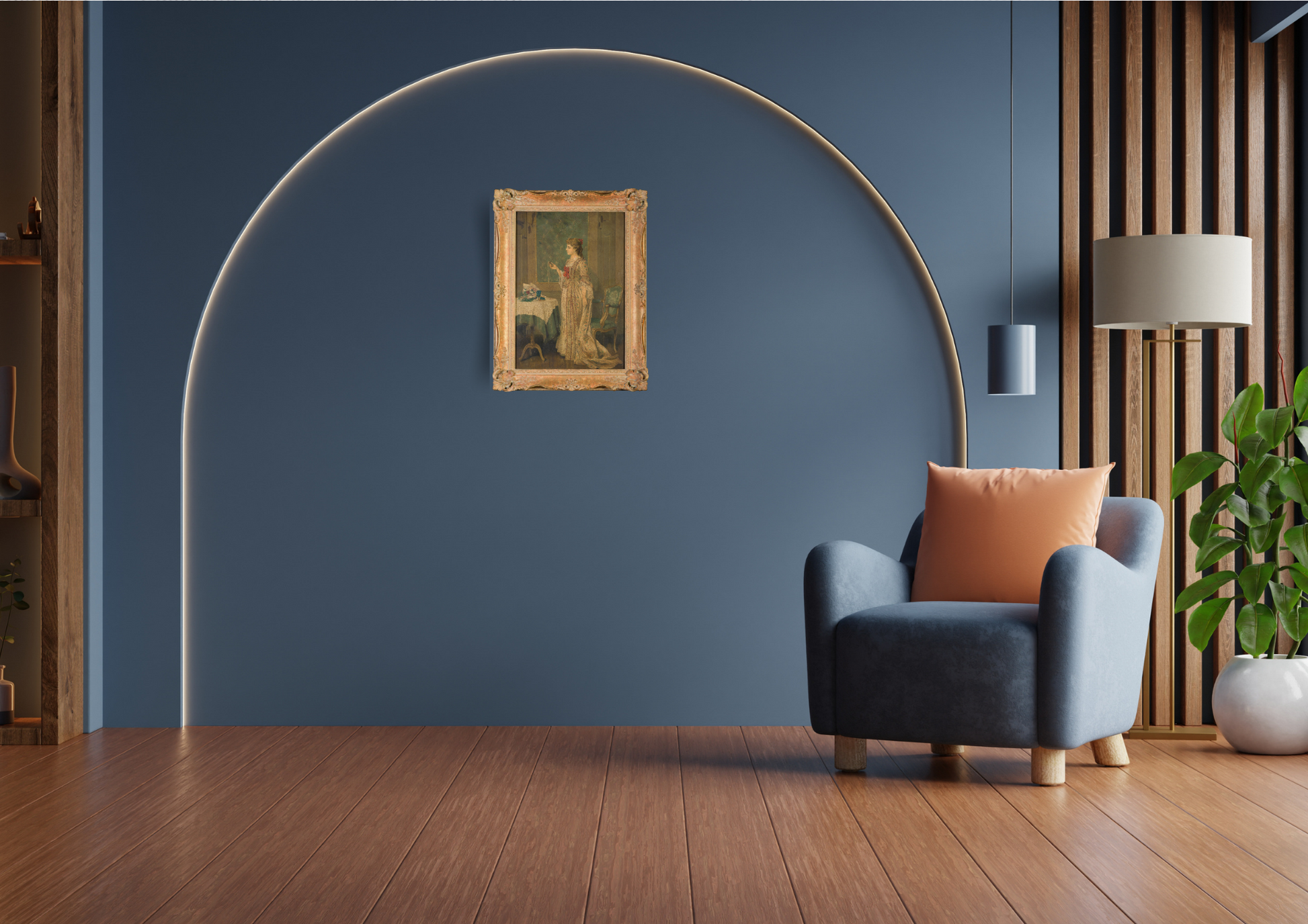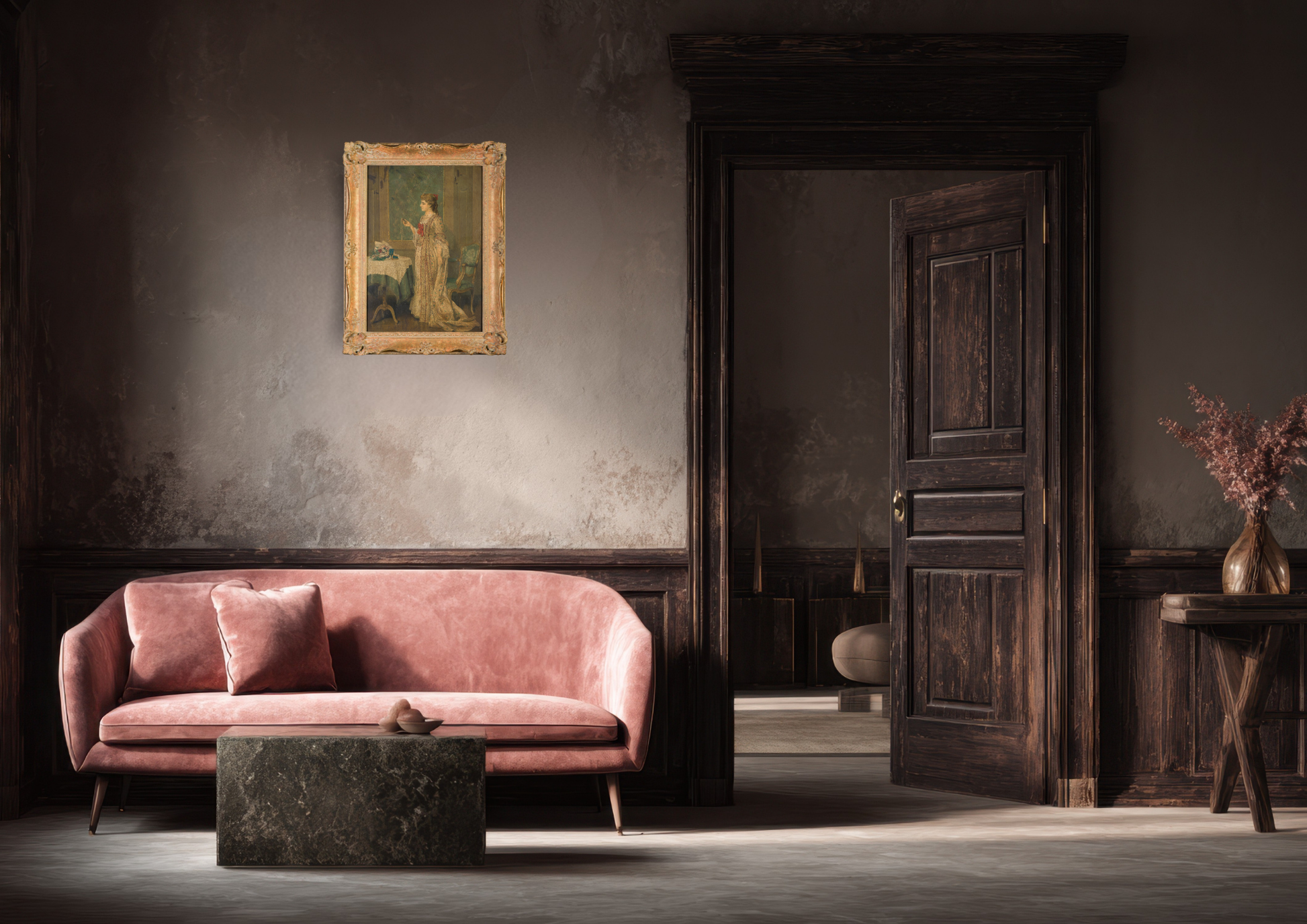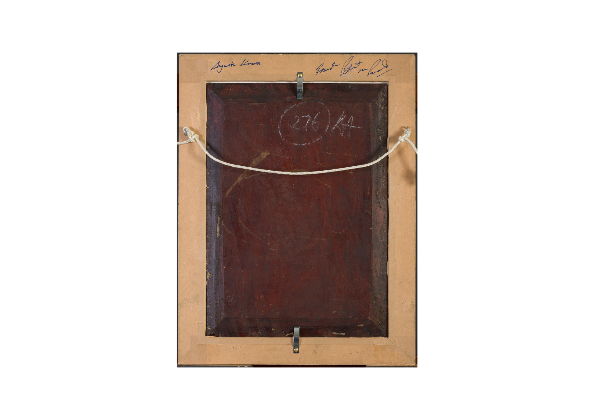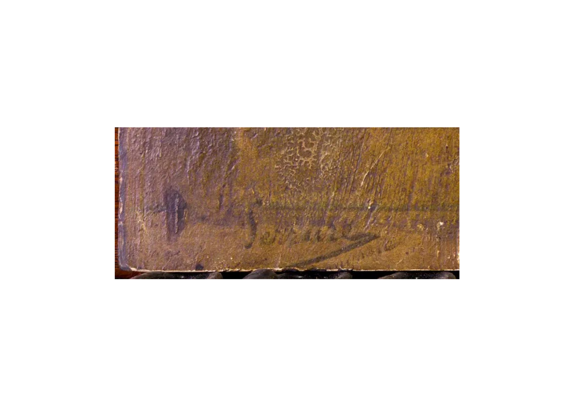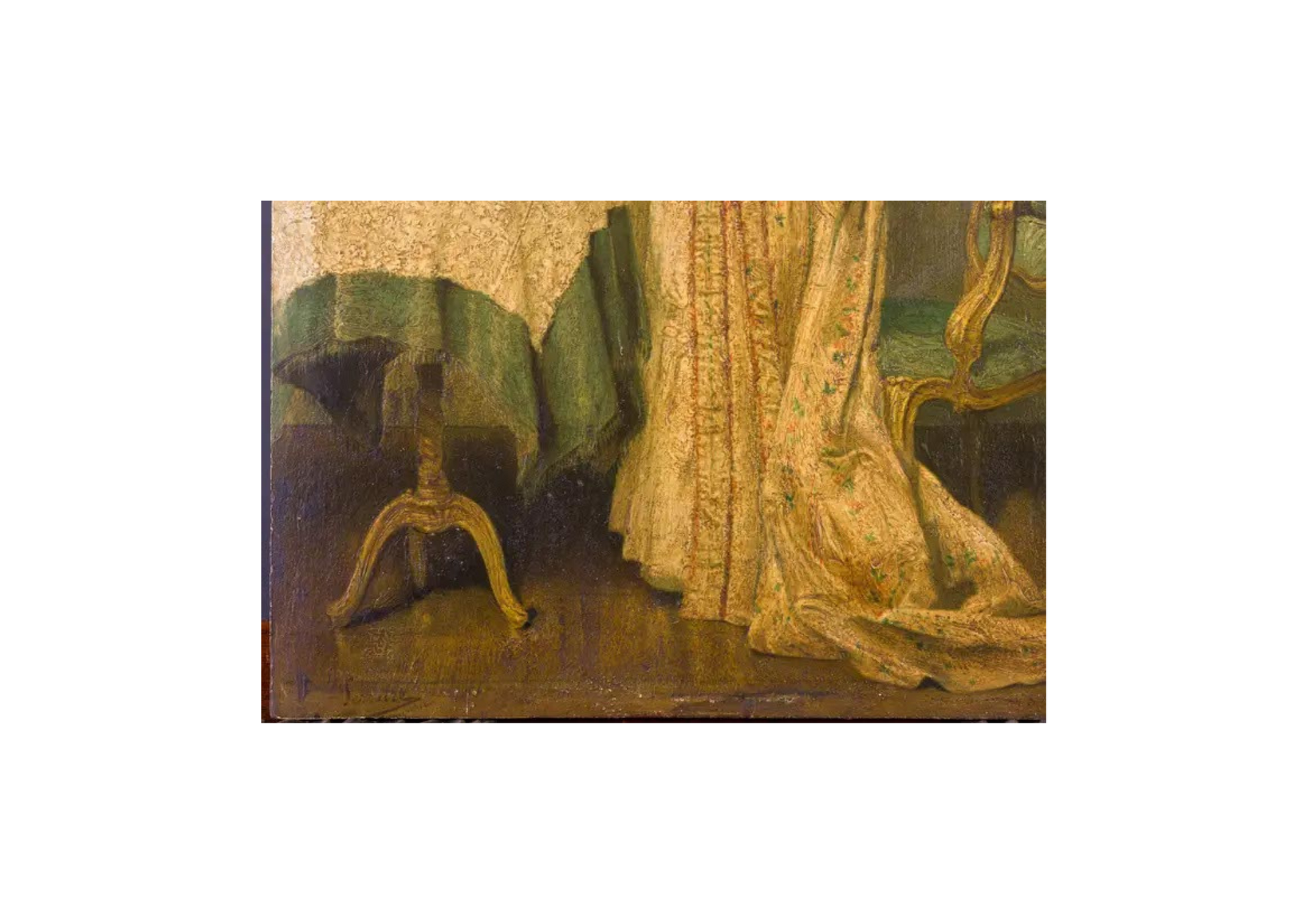 Auguste Serrure 1825 - 1903, was a Flemish born painter. The description of his birthplace is generally described as Belgium, however the Flemish nationality became Belgian in 1830 after the Revolution. Serrure painted genre interior subjects in a familiar 18th and 19th Century manner, he apprenticed under the Dutch painter Braekeleer and soon became known for his interior Dutch everyday life scenes generally among the wealthier classes. His depictions display a calm collected emotion of the scene, he exhibited in 1861 in Antwerp he also exhibited in Brussels and London, his works presented themselves as a charming event of quietude. He was a very private individual whose biography is somewhat obscure, however he died in Brussels where a large contingent of painters chose to live and was known well enough in those circles of artists. This painting is oil on mahogany panel, which in itself is a wealthy painter's board and consequently this picture would have been sold to a very well to do client, the subject shows a comfortably attired lady examining a broach or miniature, it is a prime example of the leisured classes pastime. The painting is signed and dates between 1890 and 1903.