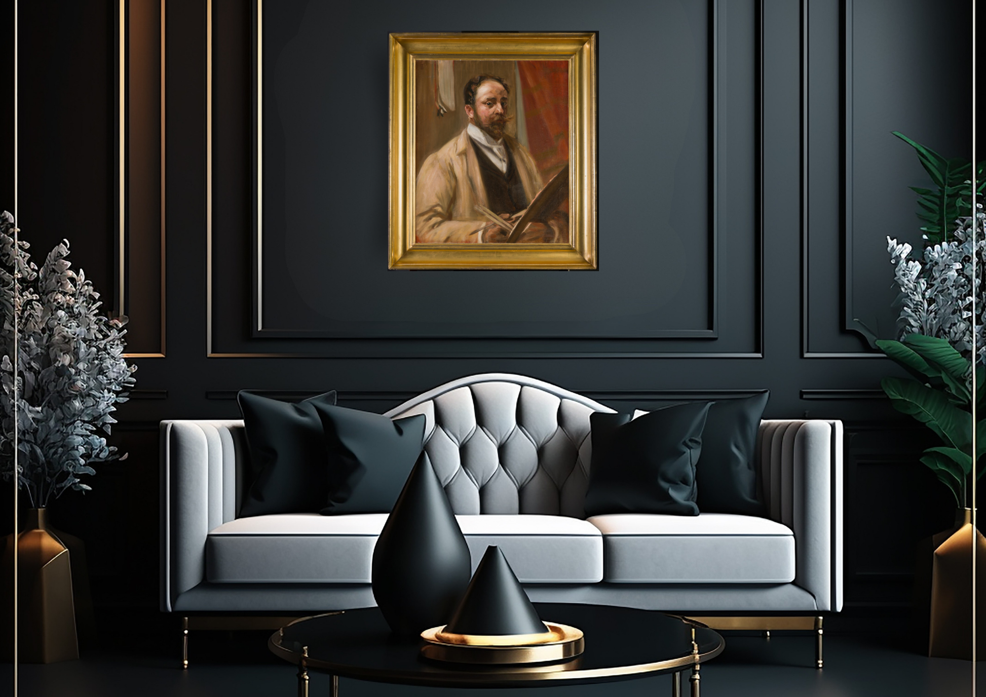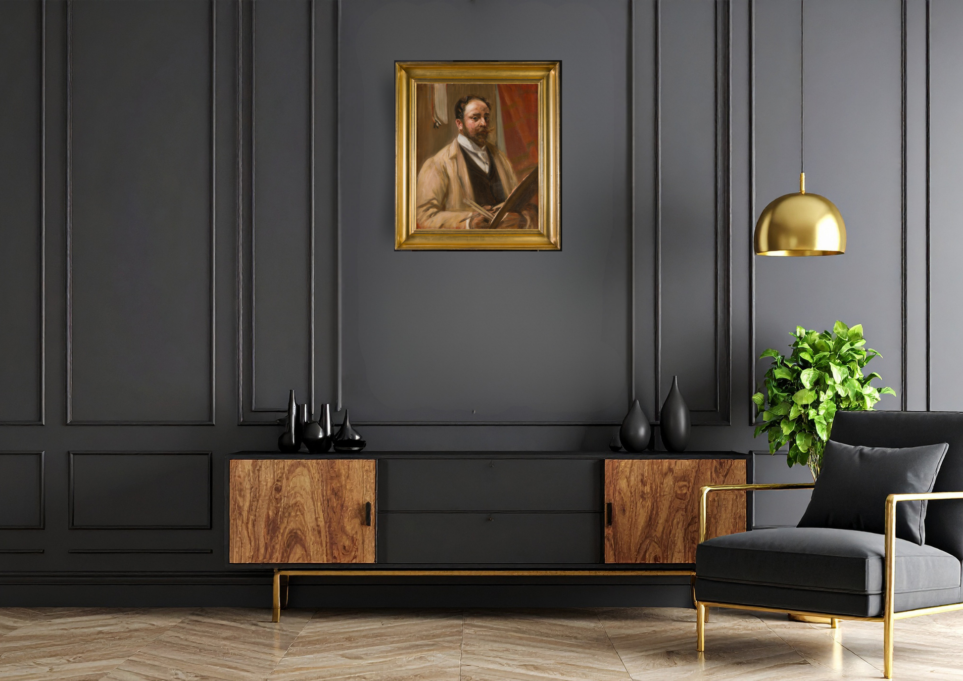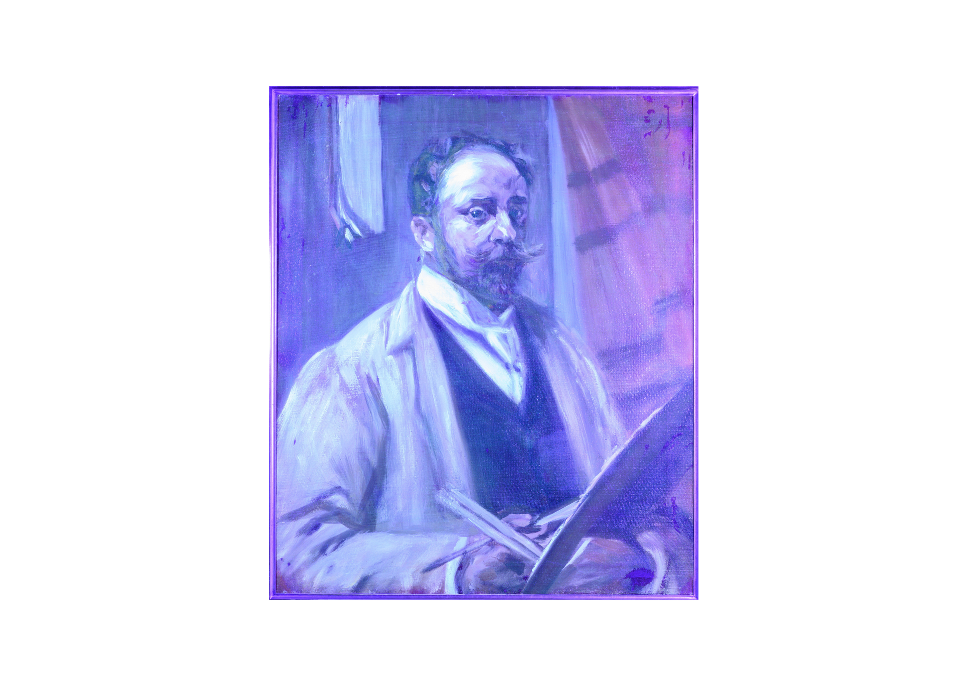 This work we are given to understand was painted by Shirlaw almost certainly from his memorable days with Chase as I believe it was painted around the turn of the 20th Century as his health probably determined the decision to paint this portrait with the knowledge of his impending demise. This painting shows Merritt Chase in his distinguished pose well known by Shirlaw for many years. This is a rare portrait from one popular artist of another. Both painters were responsible for the establishment of the Society of American Painters and they worked together teaching the next generation of popular students who were to become well known artists in their own right.