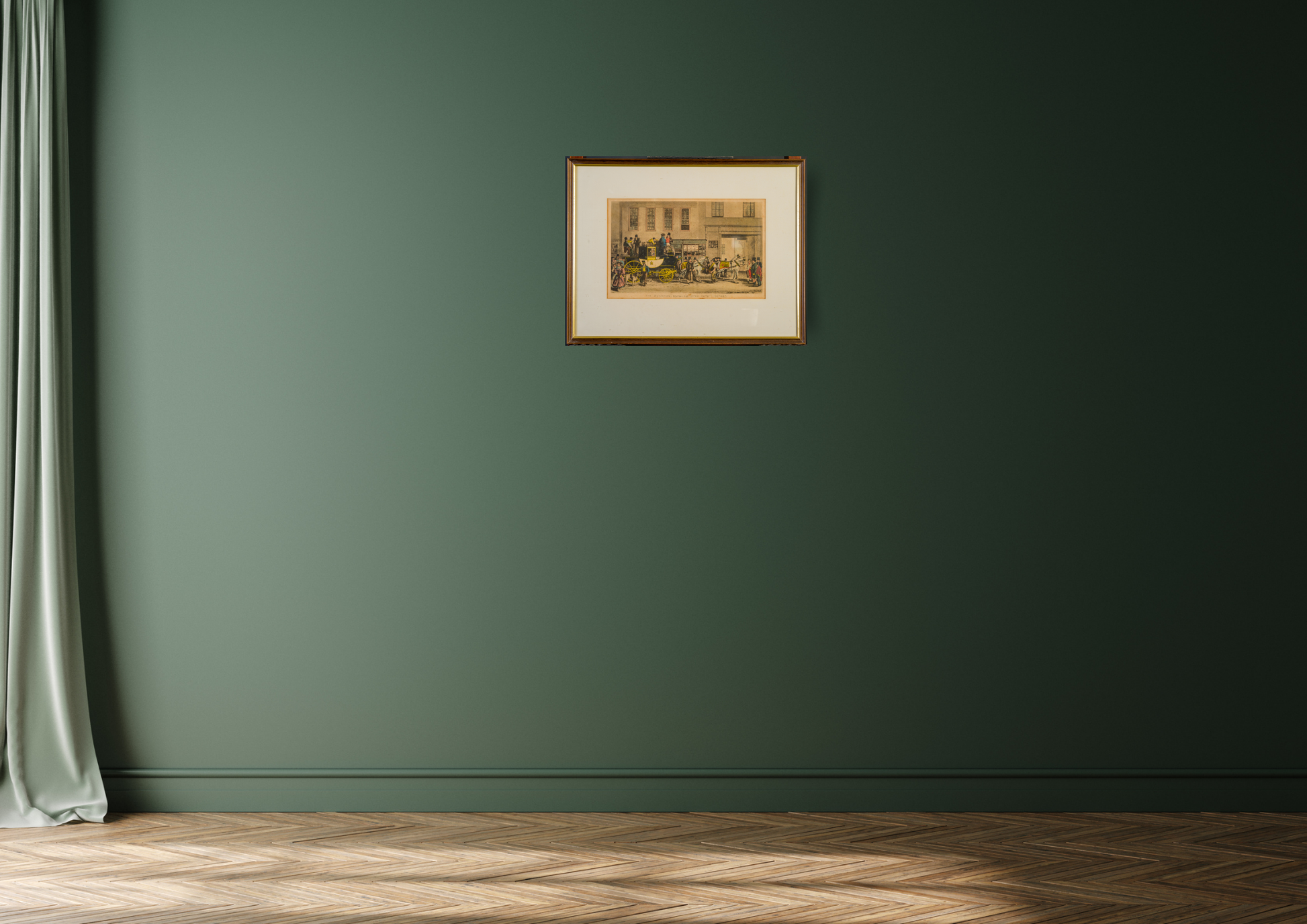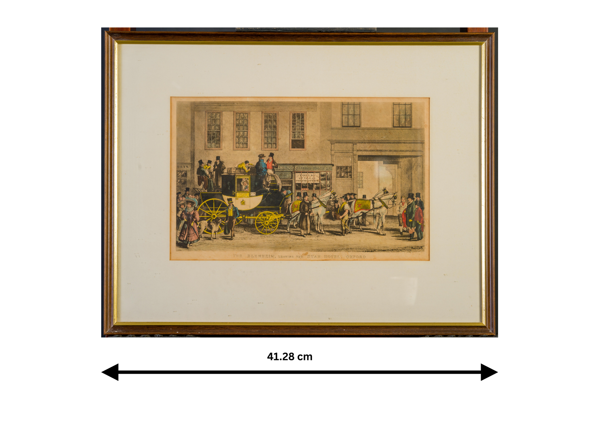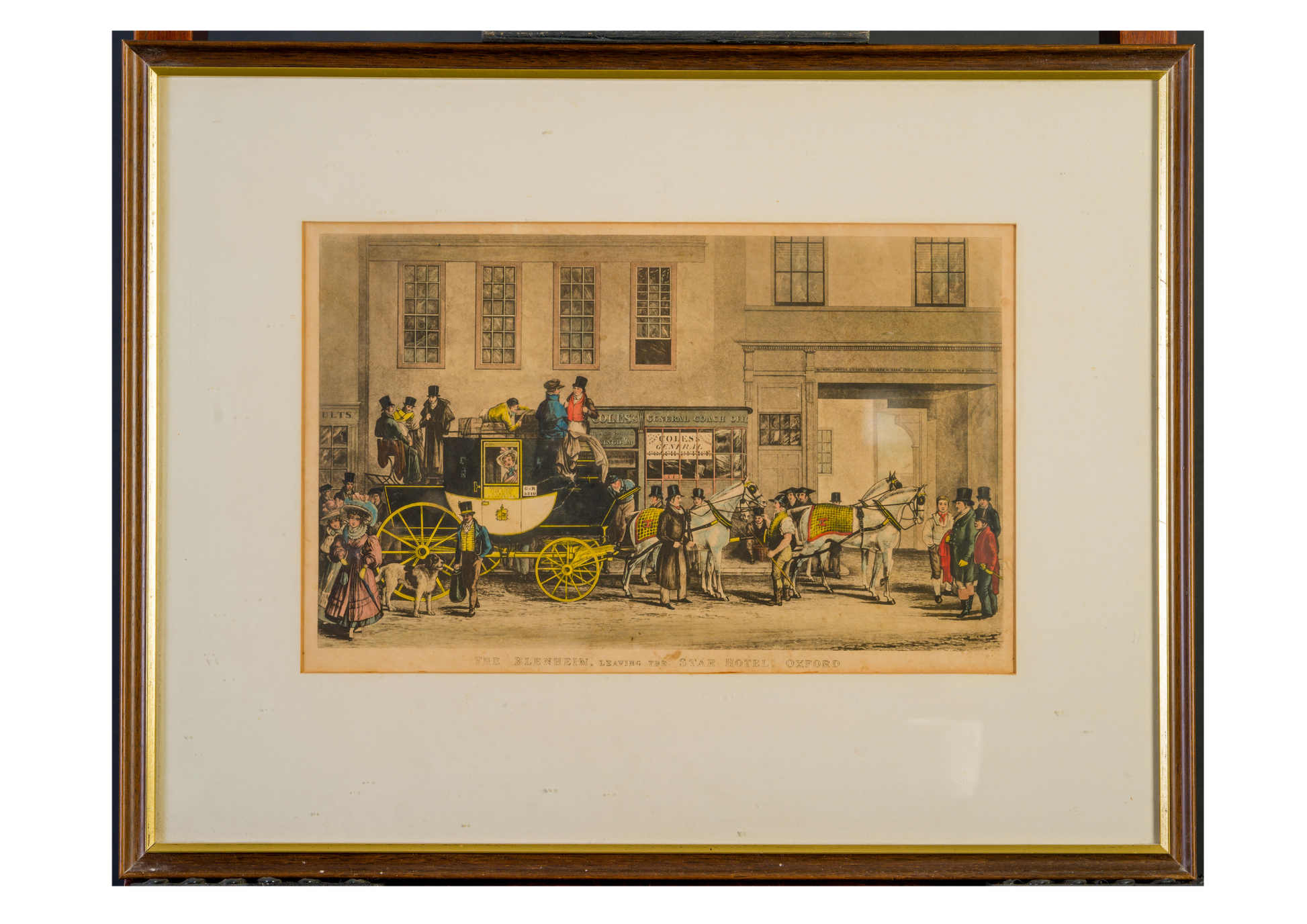 James Pollard 1792-1867, was an English painter and watercolourist. Pollard was born in North London he was the son of a painter and publisher. He exhibited at the Royal Academy, Suffolk Street Galleries and the British Institution, he established himself as a painter of coaching , fox hunting, shooting, fishing and horse racing scenes, some of which he worked with Frederick Herring senior. His fame for his coaching scenes grew from his observation of coaches passing through his residential area, he lived in North London in Islington, where the coaches would stop for refreshments and carry on to pass through to Birmingham and areas to the North, this was a regular occurrence on the Highgate Road. In 1821 Pollard was commissioned by the Kings Print seller to paint a Coaching Inn signboard showing a mail coach with horses and passengers. This was displayed in a shop window which led to a great deal of commissions for many of the same and it launched his career to further the sale of affordable prints of Coaching scenes and all the other subjects, and then, as now were very popular in the 19th Century with the middle and lower classes. These prints, 2 in the lot here, are hand coloured with watercolour the prints are early to mid 19th Century, they are framed in later oak frames. The 2 prints are Quicksilver Royal Mail and The Blenheim leaving the Star Hotel Oxford. The condition of the prints are commensurate with their age and could be reframed but we have left them as they are having been on our home wall for the last 45 years.
